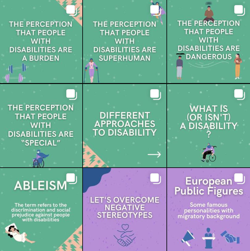 We have created an awarness campaign online (5 months- 1 topic per month; stereotypes, disability, gender equality, LGBTQ+ and racism) where each partner had to create 1 quiz and 9 posts. You can also have a look at the blog posts we have written (one for each of the previously established fields: LGBTQ+, gender equality, racism and disability) in the ‘blog’ section of the webpage.