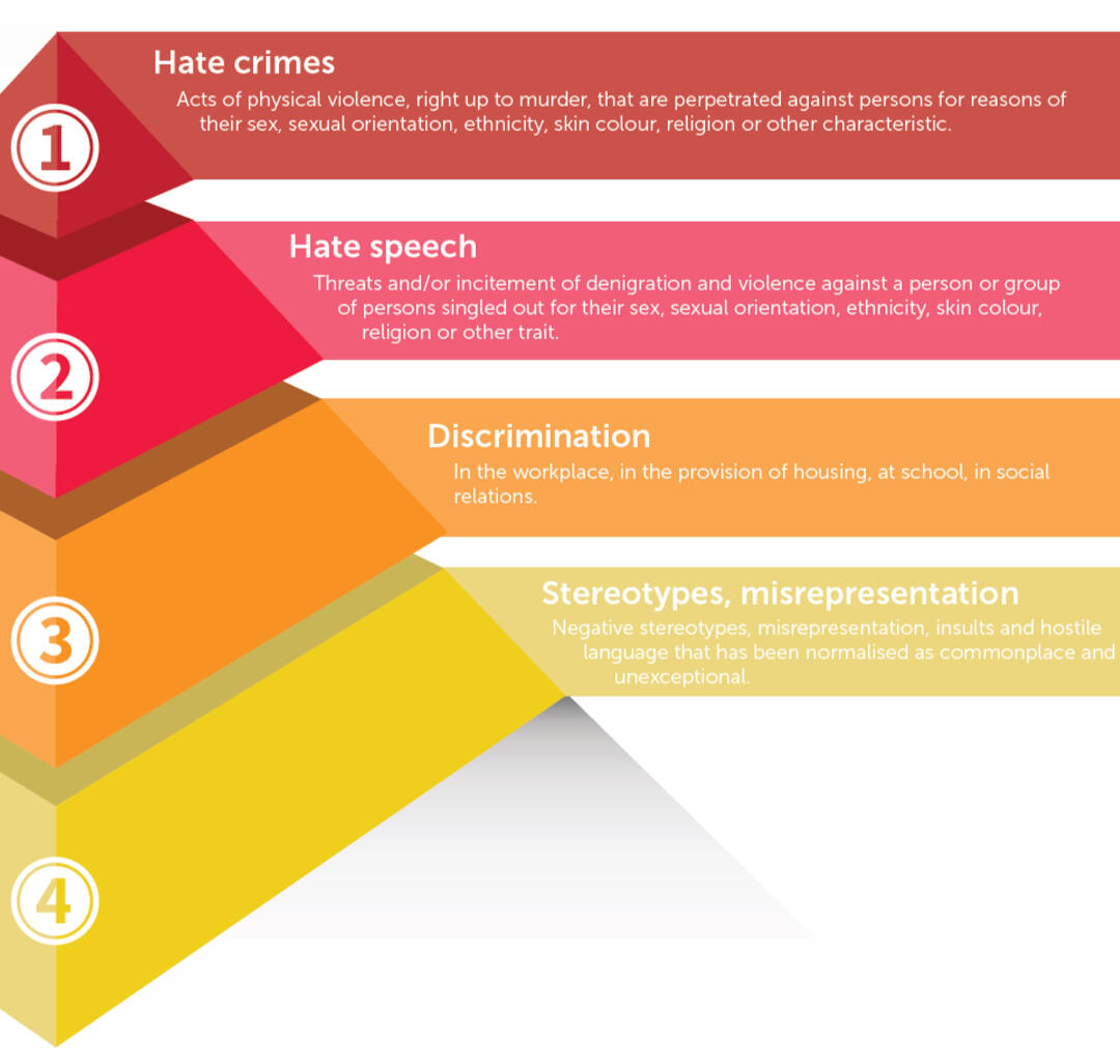 The pyramid of hatred is not an attempt to justify certain behaviours or actions, but is rather a tool that helps understand the severity of the consequences of violent acts. While the pyramid’s lower sections focus on the foundation for hate-based violence, the upper two sections relate to forms of hate-based violence, including hate speech and hate crimes, linked to gender, sexual orientation and gender identity, skin color, race/ethnicity, disability, religion or other personal characteristics.