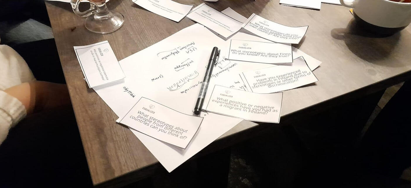 They made discussion cards related to the topics of EUqualizer project discussing stereotypes people in Finland have about their countries or other countries, and the stereotypes they have about Finnish people, as well as their experiences as a foreigner in Finland. The participants in the discussion group were both foreigners and native Finns, and a lot of cultural issues were brought up.