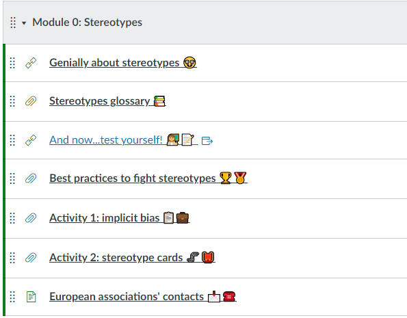The creation of the toolkit is an important tool for educators to implement the problem of stereotypes into their daily learning activities. We will create a MOOC, composed of 5 modules:
